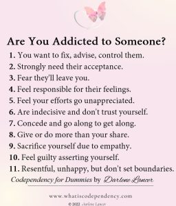 People who find themselves in addictive relationships often find it difficult to assert themselves, plainly stating their needs, wants, hopes and desires. People who find themselves in addictive relationships often have difficulty setting and enforcing boundaries. It is important to remember that your needs, wants, hopes and desires are just as important as your partner’s. It is okay to share what your needs are in clear, plain and kind language. It is okay to set boundaries with your partner, so that person knows what you will and will not tolerate in a relationship.