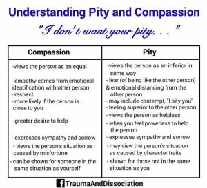 Pity is more akin to feeling sorry for someone and not really trying to understand their plight. Compassion is trying to understand someone’s experience and honoring that experience. If we are trying to gain a better understanding of another person’s emotions or experience, offering that person compassion goes a lot farther than offering someone pity.